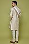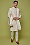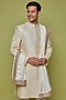 Featuring an ivory sherwani in silk dupion base with sequins and thread embroidery. It is paired with a matching kurta, churidar pants and a dupatta.