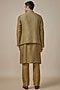 Featuring a mehendi green bundi jacket in silk base with sequins machine embroidery. It is paired with a kurta and pants. Perfect attire for a festive occasion, wedding or engagement ceremony, exuding charm and elegance.
