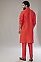 Featuring an orange kurta in faux silk base. It is paired with matching pants and a sequins dupatta. Perfect wear for festive occasions or poojas.