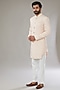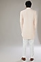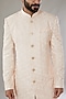 Featuring a peach sherwani in faux silk base with floral jaal thread and cutdana embroidery. It is paired with a matching kurta and contrasting pants. Perfect wear for pre-wedding or festive occasions.