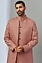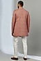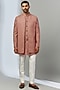 Featuring a peach indowestern jacket in silk base with cutdana embroidery. It is paired with a matching shirt and contrasting pants.