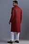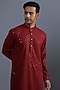 Featuring a red kurta in cotton base with thread and sequins embroidery. It is paired with contrasting pyjama pants.