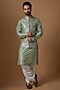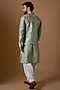 Featuring a sage green bundi jacket in jacquard base with jaal embroidery. It is paired with a matching kurta and patiala pants.