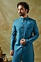 Featuring a teal blue nawabi sherwani in PV stretch base with metal buttons. It is paired with contrasting trousers. Perfect wear for a wedding, sangeet or reception ceremony.