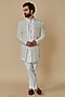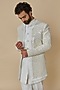 Featuring a white indo-western jacket in japanese stretch and georgette base with sequins embroidery. It is paired with a kurta and pants. This attire would be an excellent fit for an engagement, sangeet or wedding ceremonies.