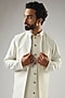 Featuring a white indo-western jacket in japanese polyester viscose base with geometric french knot and jaal embroidery. It is paired with an achkan kurta and pants. Perfect wear for an engagement or pre-wedding ceremony.