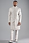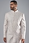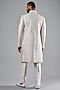 Featuring a white sherwani in silk base with thread, motifs hand and machine embroidery. It is paired with matching pants, a pair of shoes.