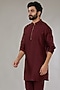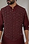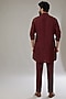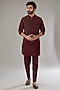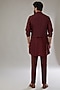 Featuring a wine red bundi jacket in silk base with geometric front knot and cutdana embroidery. It is paired with a matching kurta and pants. Perfect wear for engagement or wedding ceremonies.