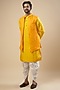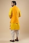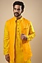 Featuring a yellow indo-western jacket in silk base with mirror work. It is paired with a kurta and dhoti pants. Perfect wear for festive occasion or wedding.