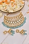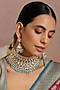 Featuring a gold finish handcrafted choker necklace studded with kundan polki, set in brass. It is paired with a matching pair of earrings.