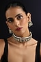 Featuring a gold finish handmade choker necklace studded with emeralds and kundan polki, set in brass. It is paired with a matching pair of earrings. Perfect for any festive occasions, evening soirees or cocktail party.