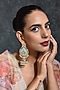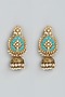 Featuring a pair of gold finish handcrafted jhumka earrings studded with kundan polki and blue enamaled paint, set in mixed metal.