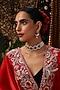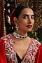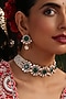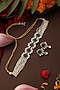 Featuring a gold finish choker necklace studded with kundan polki and emerald stones, set in brass. It is paired with a matching pair of earrings. Perfect choice for festive celebrations or other Indian festivities.