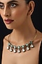 Featuring a gold finish hasli necklace studded with kundan polki and mint stones, set in brass. It is paired with a matching pair of earrings. This necklace set embodies refined elegance and timeless style, perfect for festive occasions or wedding ceremonies.