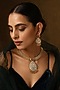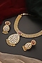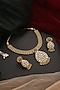 Featuring a gold finish temple necklace studded with kundan polki, set in brass. It is paired with a matching pair of earrings. Perfect wear for wedding celebrations or grand events.