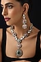 Featuring a gold finish handmade long necklace studded with multi-colored kundan polki, set in brass. It is paired with a matching pair of earrings. Perfect for any festive occasions, evening soirees or cocktail party.