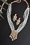 Featuring a gold finish handcrafted long necklace studded with red kundan polki and pearls, set in brass. It is paired with a matching pair of earrings.