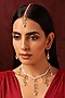 Featuring a gold finish handcrafted necklace studded with white kundan polki and pearls, set in brass. It is paired with a matching pair of earrings and a maangtikka.