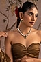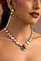 Featuring a rose gold finish pendant necklace studded with emerald green kundan polki, set in brass. It is paired with a matching pair of earrings. Ideal for festive occasions, weddings, or elevating your elegant evening look.