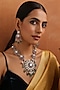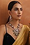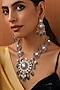 Featuring a rose gold finish handmade long pendant necklace studded with multi-colored kundan polki, set in brass. It is paired with a matching pair of earrings. Perfect wear for festive occasions or wedding ceremonies.