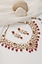 Featuring a rose gold finish handcrafted necklace studded with red kundan polki, set in brass. It is paired with a matching pair of earrings. Perfect wear for festive occasions or wedding ceremonies.