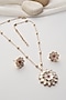 Featuring a rose gold finish handcrafted pendant necklace studded with red kundan polki, set in brass. It is paired with a matching pair of earrings. Perfect wear for festive occasions or wedding ceremonies.