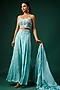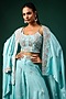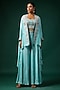 Featuring an aqua cape in silk base with embroidery. It is paired with a singlet top and flared pants. Accentuate with statement earrings and heels for festive occasions or sangeet ceremonies.