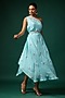 Featuring an aqua one-shoulder dress in silk base with a v-neck and embroidery. It is paired with an embroidered belt. Accentuate with statement earrings and heels for festive occasions.