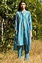 Featuring a turquoise tunic in silk chanderi and cotton satin base with print. It is paired with matching pants.