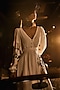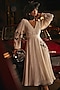 Featuring a white flared dress in crepe base with lantern sleeves, cinched waist, machine and hand embroidery. Style with a sleek clutch and embellished heels for a graceful look, perfect for festive gatherings or after party.