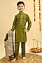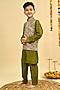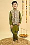 Featuring an olive green nehru jacket for boys in dola silk base with embroidery. It is paired with a kurta and pants. Style it with juttis and a watch for a festive occasion or wedding ceremony.