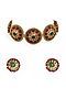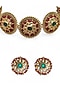 Featuring a gold finish choker necklace studded with green imitation kundan polki and semi-precious stones, set in brass. It is paired with a matching pair of earrings. Perfect choice for weddings or other Indian festivities.