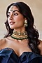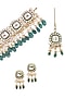 Featuring a gold finish necklace studded with green imitation kundan polki and semi-precious stones, set in brass. It is paired with a matching pair of earrings and a maangtikka. Perfect choice for weddings or other Indian festivities.