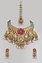 Featuring a gold finish necklace studded with imitation kundan polki, pink quartz and semi-precious stones, set in brass. It is paired with a matching pair of earrings and a maang tikka. Perfect wear for a festive occasion or wedding ceremony.