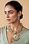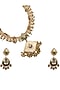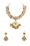 Featuring a gold finish necklace studded with multi-colored imitation kundan polki and semi-precious stones, set in brass. It is paired with a matching pair of earrings. Perfect choice for weddings or other Indian festivities.