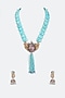 Featuring a two tone finish necklace studded with imitation polki and semi precious turquoise stones, set in brass. It is paired with a matching pair of earrings.