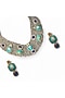 Featuring a two-tone finish necklace studded with imitation kundan polki and turquoise stones, set in brass. It is paired with a matching pair of earrings. Perfect choice for weddings or other Indian festivities.