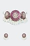 Featuring a two tone finish necklace studded with imitation polki and semi precious stones, set in brass. It is paired with a matching pair of earrings.