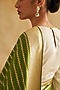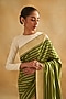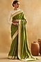 Featuring a green saree in pure katan silk base with pure zari border and cutwork embroidery. It is paired with a pure satin silk blouse and a satin underskirt. Accentuate it with statement jewellery or heels for a festive occasion or pooja ceremony.