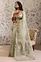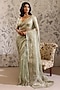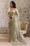 Featuring a green saree in pure striped tissue base with tussar silk border. It is paired with a pure georgette handwoven floral banarasi blouse and a satin underskirt. Accentuate it with chandbali earrings, a clutch bag and kolhapuri heels for a festive or a sangeet look.