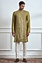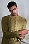 Featuring a green kurta in cotton tussar base with hand and machine embroidery. It is paired with pants. Accentuate it with juttis and a watch for a mehendi ceremony or festive occasion, exuding traditional charm and elegance.
