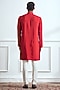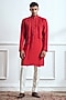 Featuring a red kurta in cotton tussar base with pintucks and zari hand embroidery. It is paired with contrasting pants.