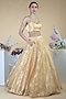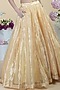 Featuring a gold circular flared lehenga in tissue base. It is paired with a matching blouse and a tulle net dupatta.