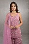 Featuring a mauve kurta in silk organza base with hand embroidery. It is paired with matching gharara pants and a tulle dupatta.