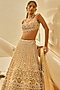 Featuring a biscuit-colored lehenga in tulle base with sequins, beads, metallic thread work, stones, pearls, zari, cutdana, mirror, resham and badla hand embellishments. It is paired with an embellished blouse and a sheer embellished dupatta. Accentuate the designer lehenga with pearl or swarovski jewellery, embellished heels and a clutch for a bridal look, Perfect wear for your wedding or engagement ceremony.