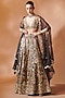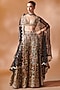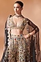 Featuring a black cape in georgette base with mirror, resham and gota embroidery. It is paired with sharara pants and a blouse. Accentuate it with kundan polki or zircon jewellery, embellished heels and a potli bag for a wedding or engagement ceremony.