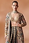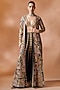 Featuring a black jacket in georgette base with mirror, resham and gota embroidery. It is paired with black and gold sharara pants, including a bralette. Accentuate it with kundan polki or zircon jewellery, embellished heels and a potli bag for a wedding or sangeet ceremony.