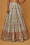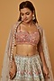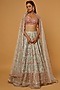 Featuring a blue lehenga in net base with resham, gota, dori, and mirror embroidery. It is paired with a contrasting embroidered blouse and a dupatta.