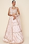 Featuring a blush pink tiered lehenga in chanderi base with resham, gota, foil, mirror and dori embroidery. It is paired with a matching blouse and a net dupatta.
