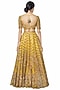 Featuring a bright yellow lehenga skirt in net base with foil, reshma, dori and gota embroidery. It is paired with a matching blouse and green dupatta.